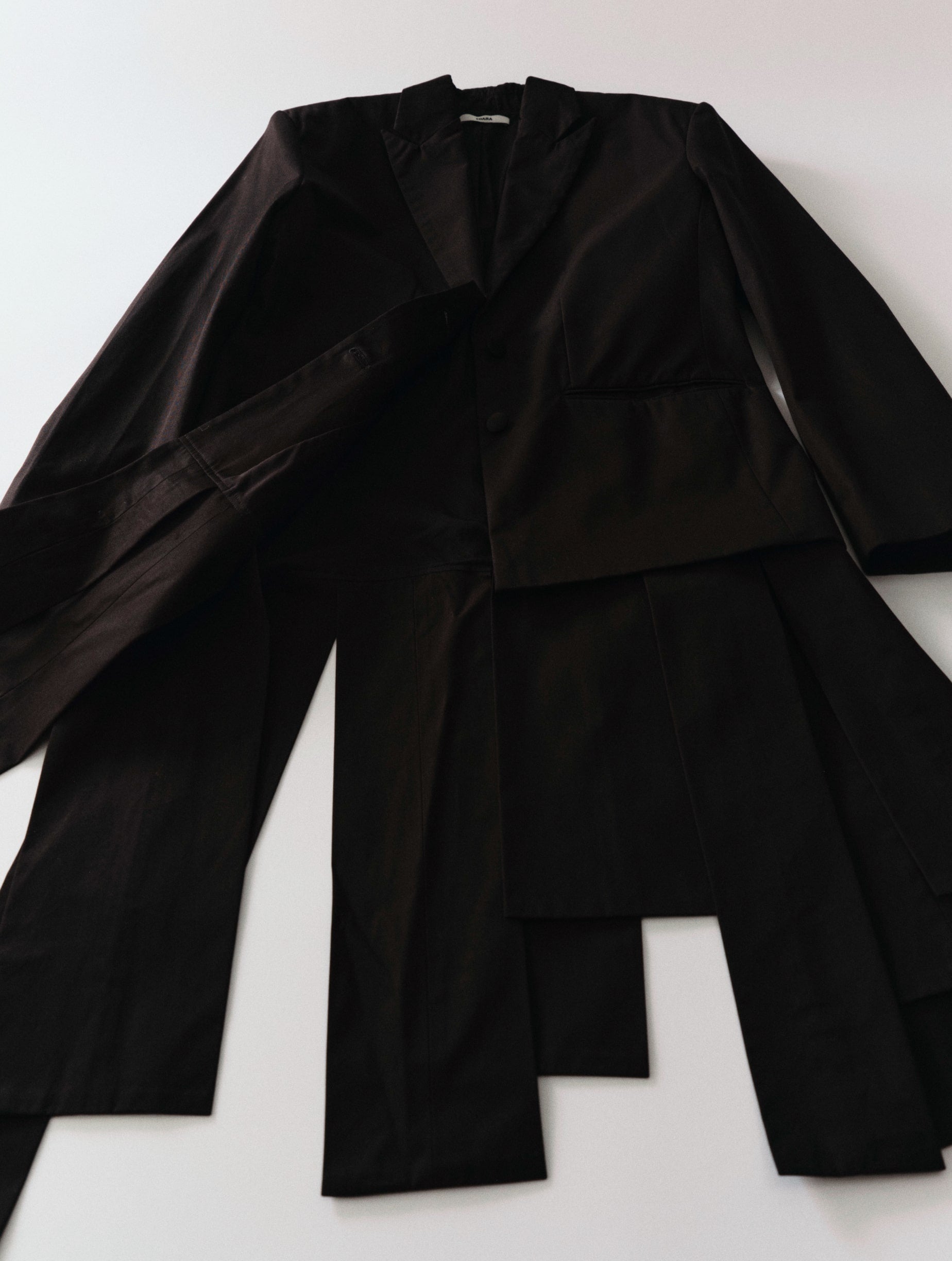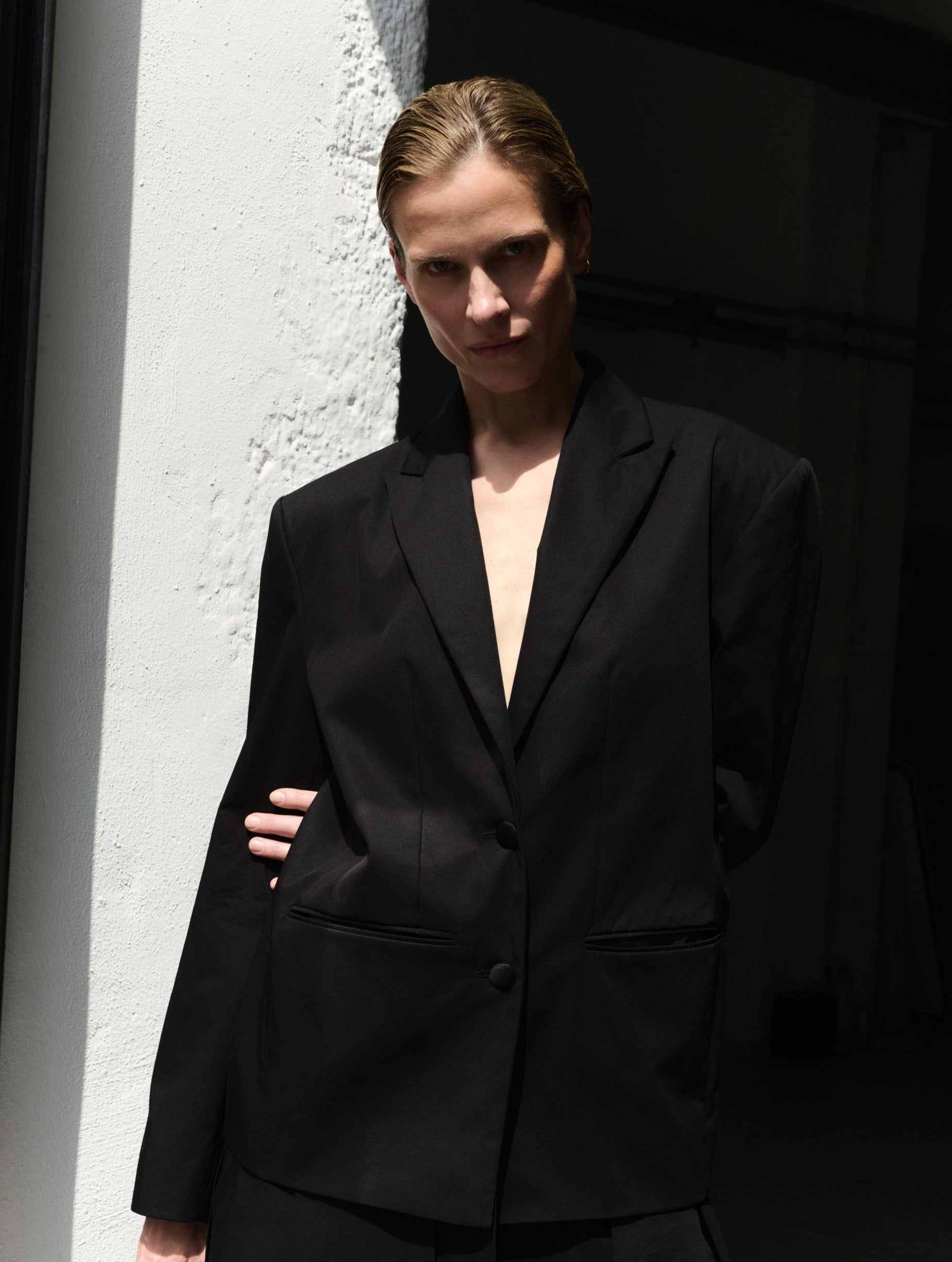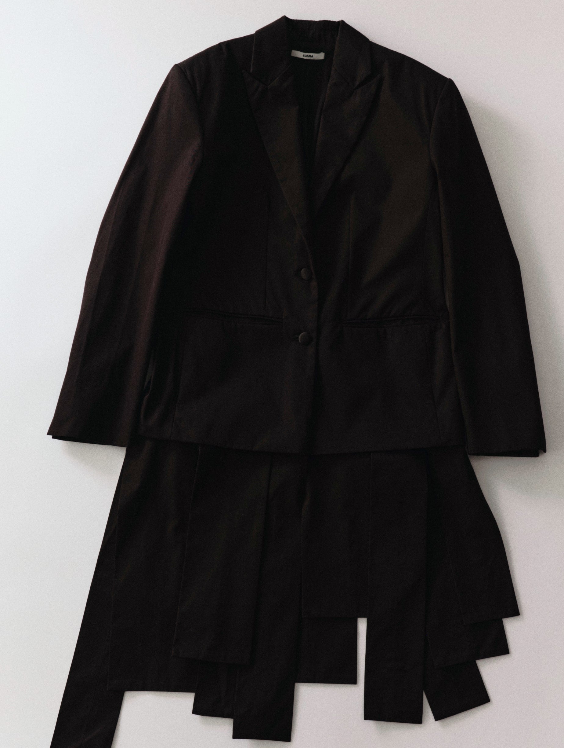 This blazer features fringe-style trim at the hem for a chic, textured finish. Structured with handmade shoulder pads for a sharp silhouette, it is fastened with two fabric-covered buttons for an elegant touch. Equipped with two pockets, this piece can be styled as a blazer or worn as a dress, offering a stylish and multifunctional addition to the wardrobe.