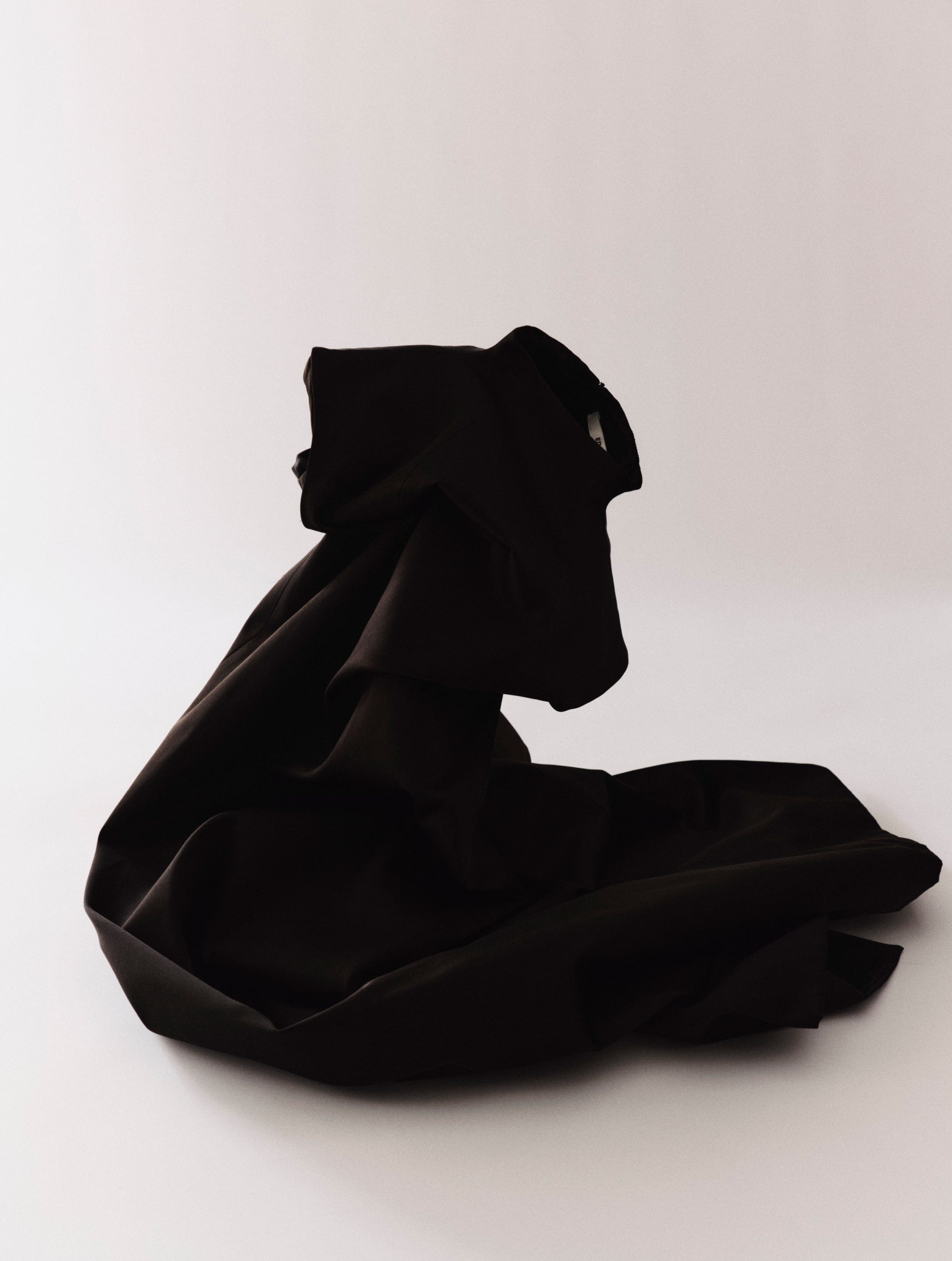 Long black double face satin duchess dress with padded shoulders and back vent.