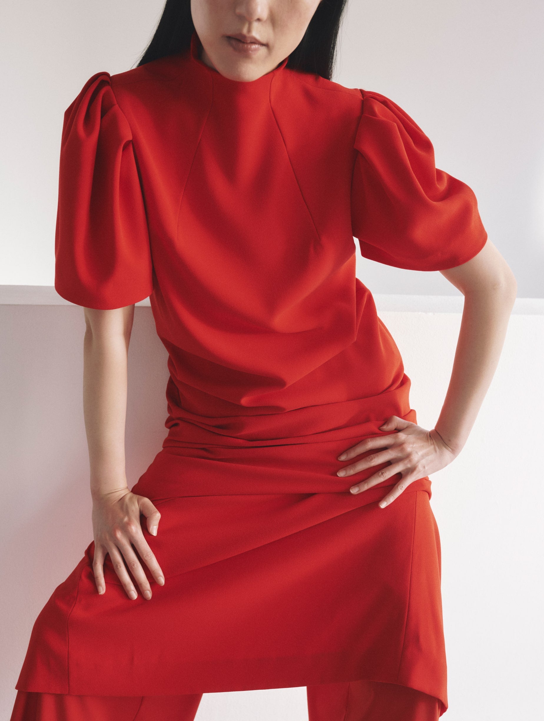 This dress showcases delicately draped puff sleeves that provide a refined volume while maintaining fluidity. Crafted for an effortlessly elegant and relaxed silhouette, it gently cascades over the body. The high neckline exudes sophistication, complemented by an invisible back zipper for a clean, uninterrupted finish. A subtle back slit enhances mobility.