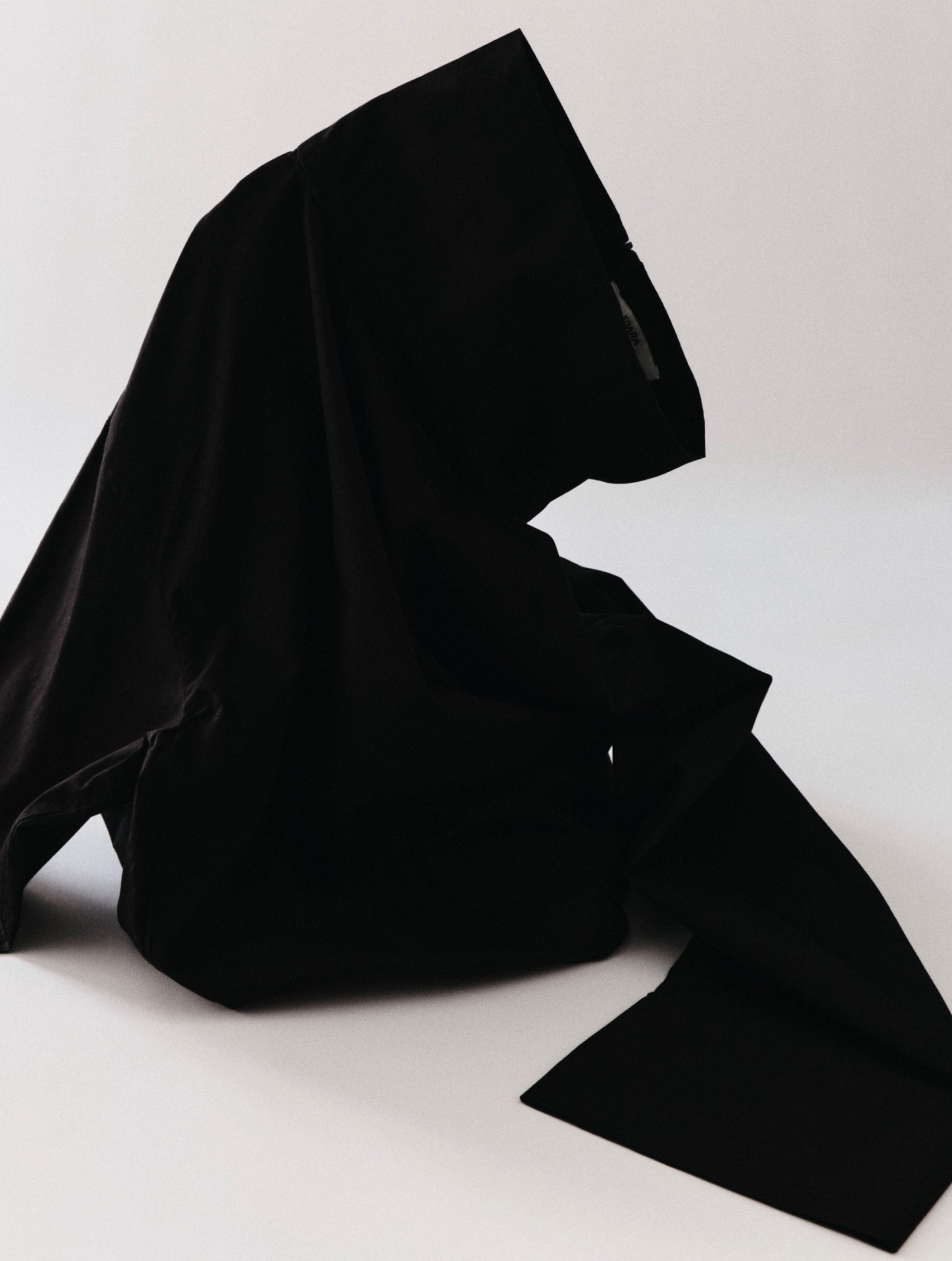 This blouse features a striking high stand collar and a clean, defined silhouette. The long sleeves with wide cuffs add a modern, sculptural touch. An invisible zipper at the back ensures a seamless look and easy dressing.