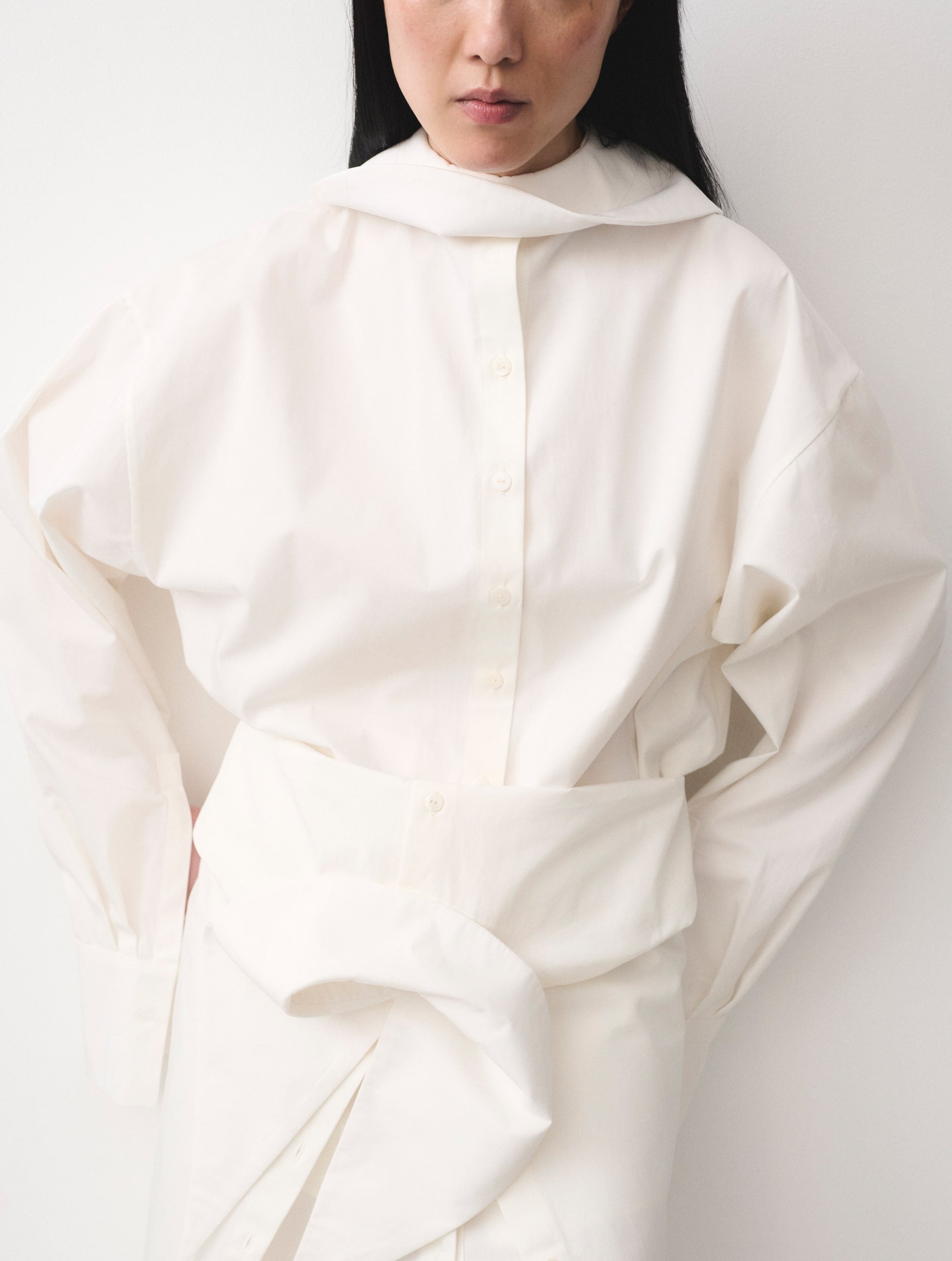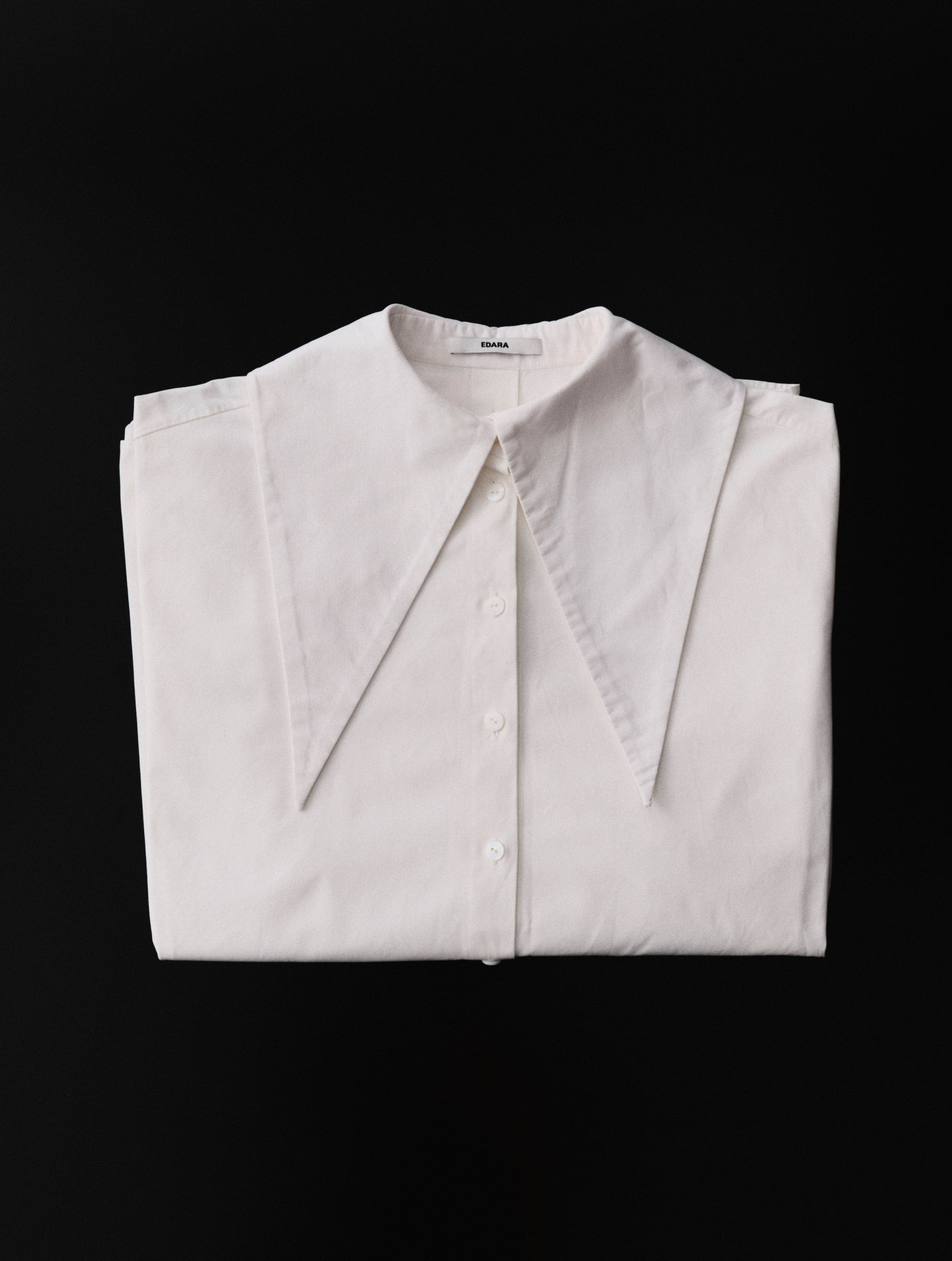 This oversized blouse is designed with openings at both the front and back, featuring a statement collar for a bold touch. Accented with genuine mother-of-pearl buttons, it offers versatile styling options for a refined yet contemporary look.