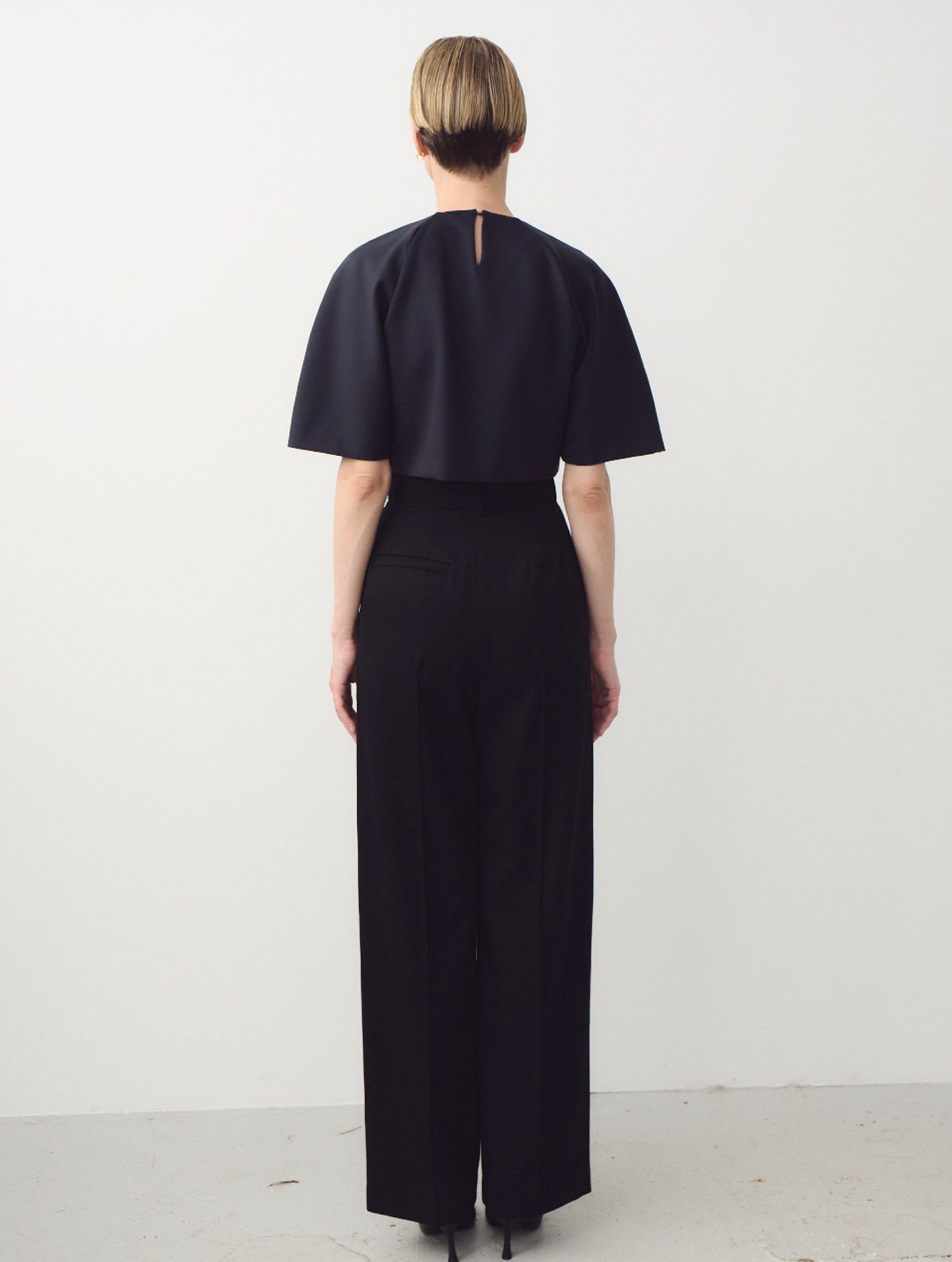 Tailored trousers in black wool. Wide-leg with pockets at the sides. Designed to be extra long. The trousers have a pleated front and back.