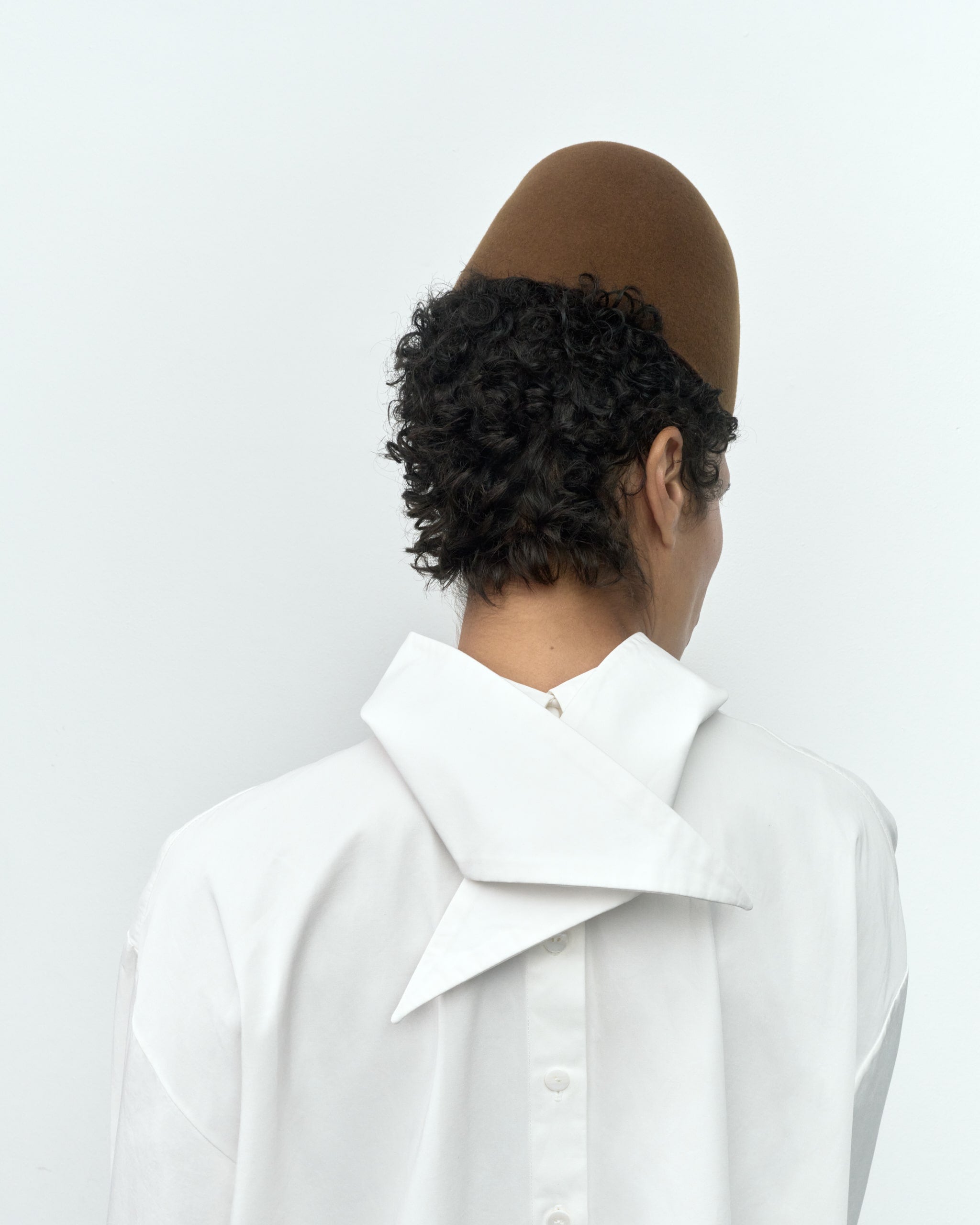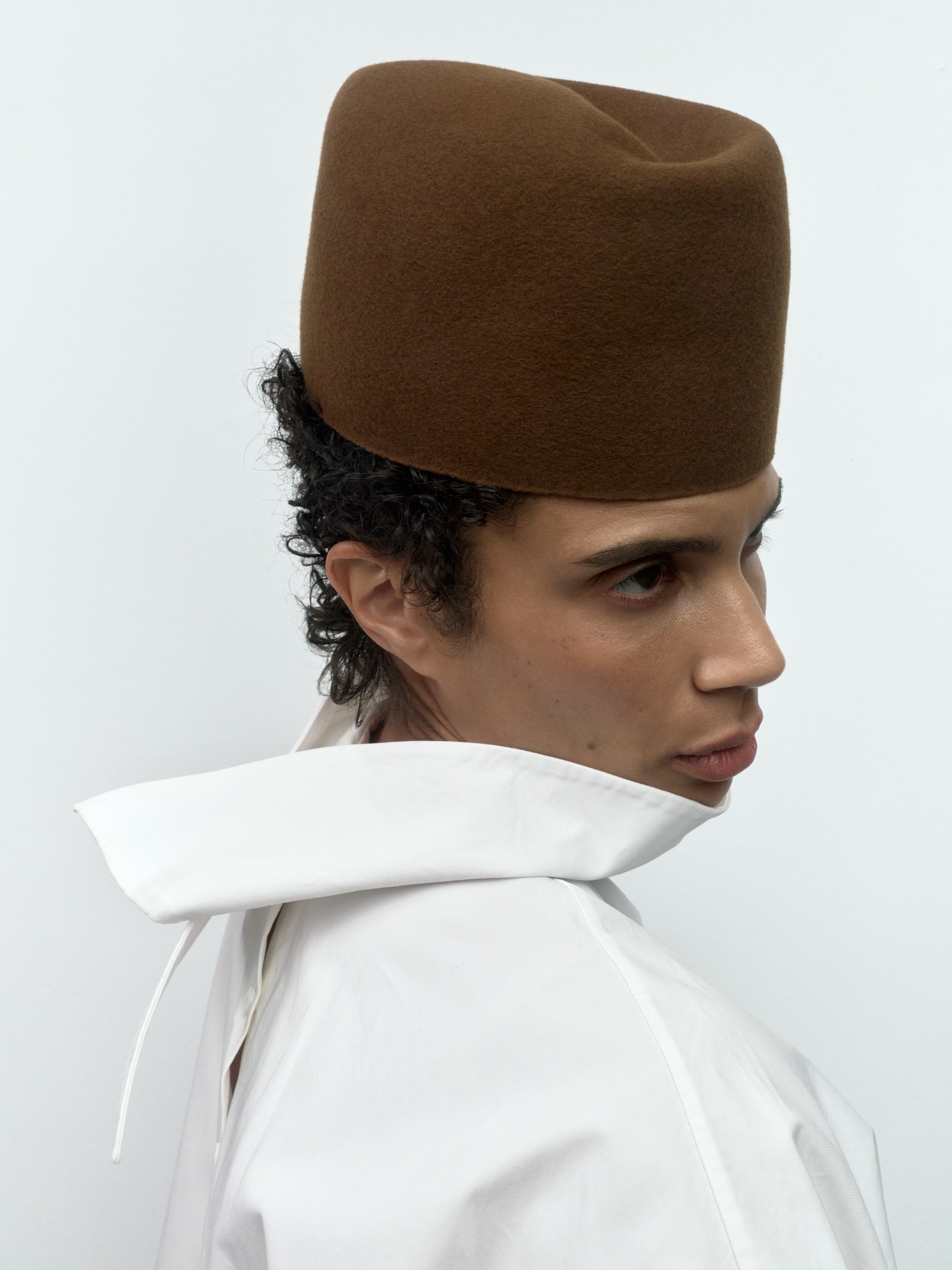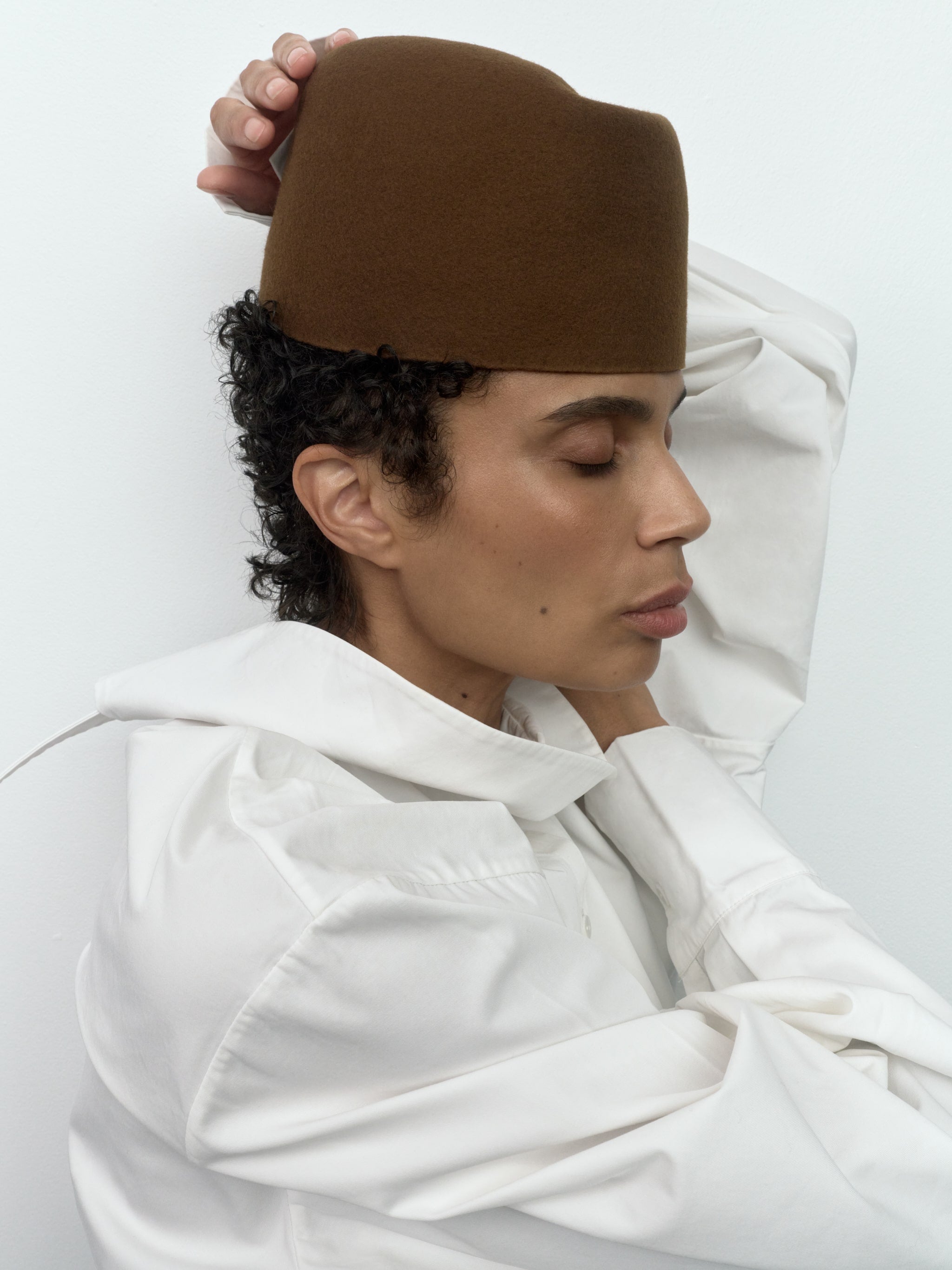 THE HAT JULIA in Amber Brown is crafted from premium felted wool for a soft yet structured silhouette. Inspired by the classic pillbox shape, its minimalist dome form and seamless construction evoke timeless sophistication. The clean, sculptural lines make it a versatile accessory that transitions effortlessly between modern and vintage-inspired ensembles.