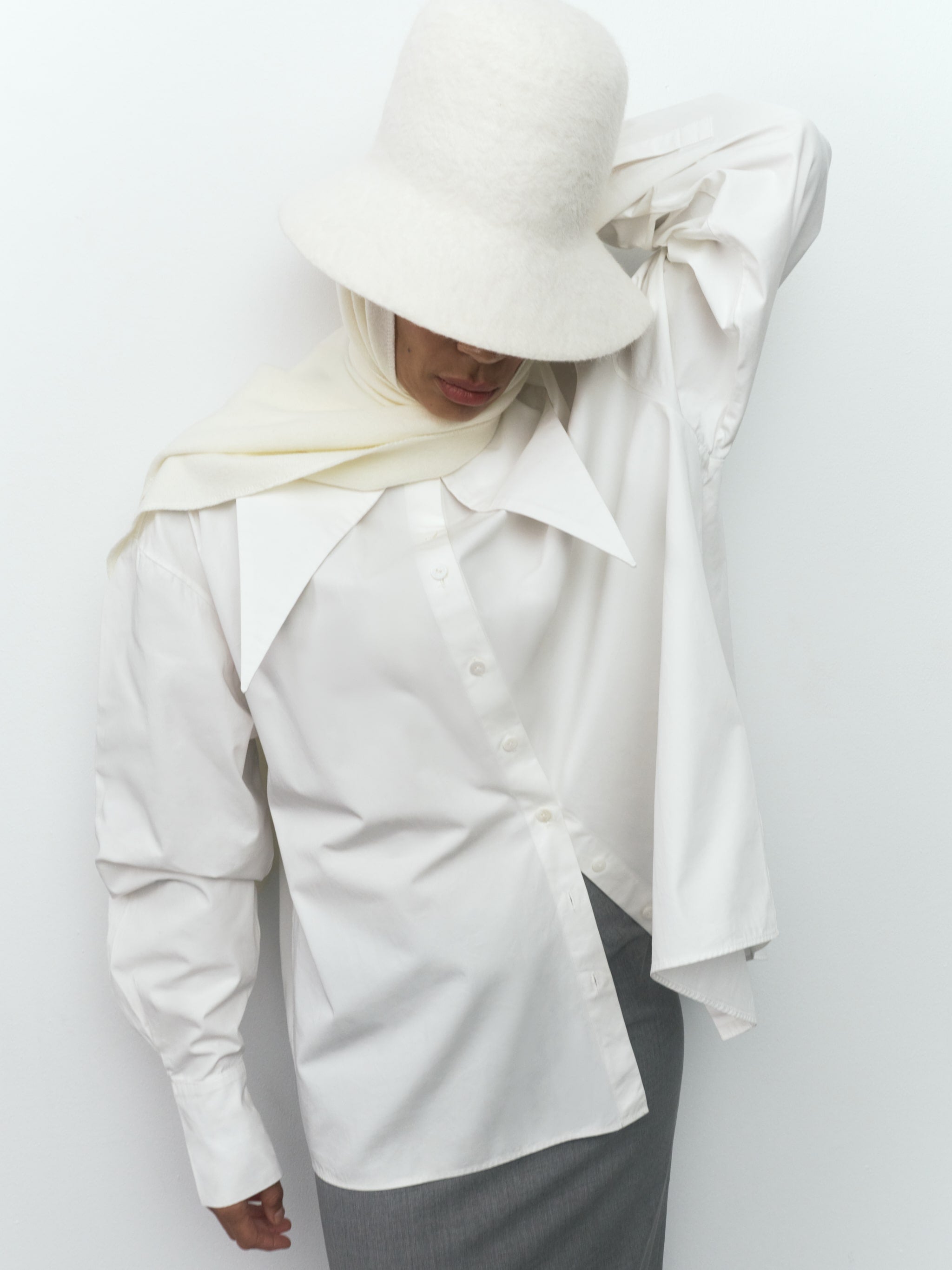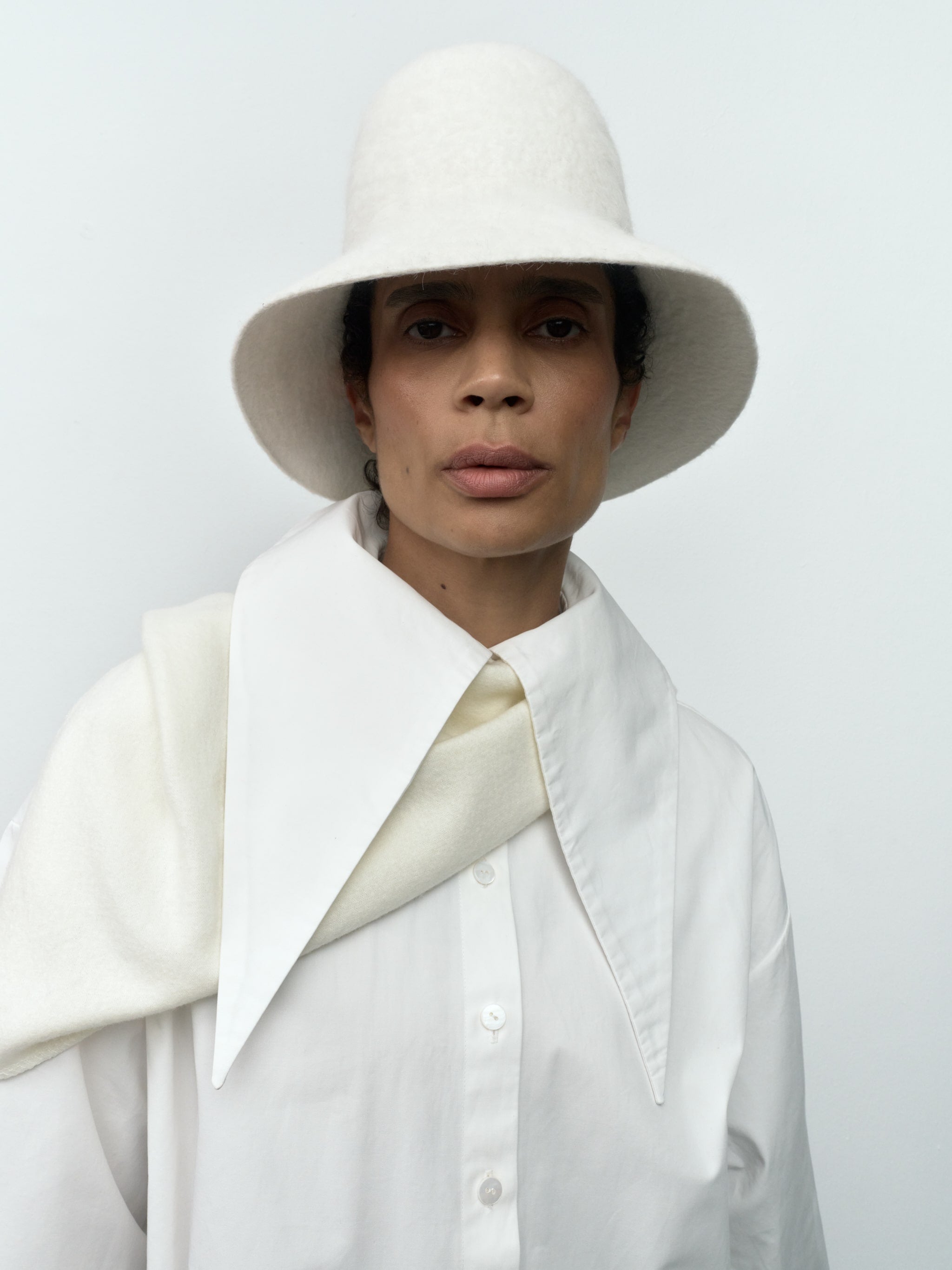 THE HAT LINA in Ivory White is crafted from premium felted wool, offering a soft yet sculptural silhouette. Featuring a gently flared brim and rounded crown, the design reinterprets the classic cloche hat with a modern minimalist sensibility. The seamless construction and tactile texture create a fluid, organic form that frames the face with quiet elegance.