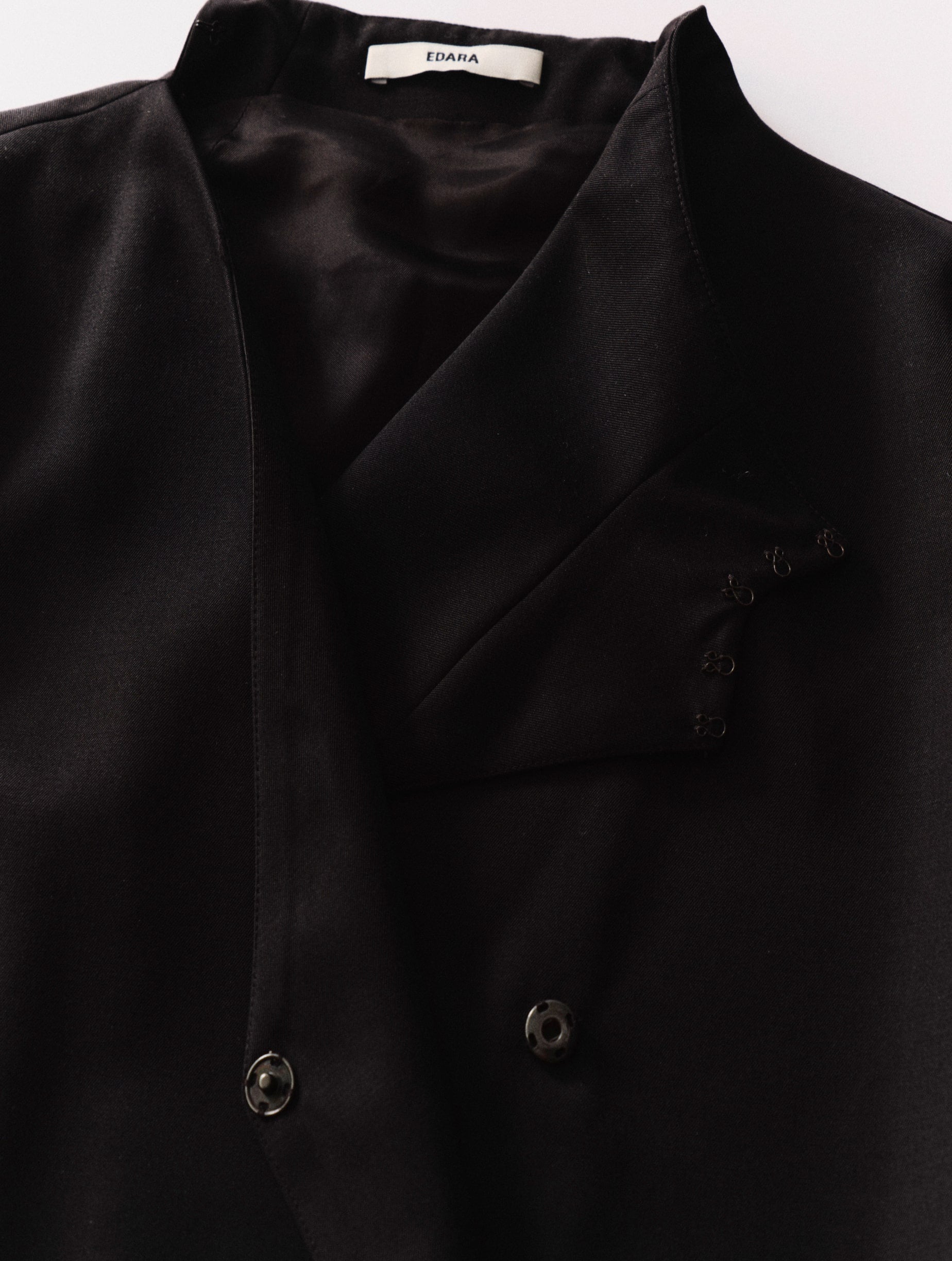 Asymmetrically shaped blazer with two different sleeves, shoulder shapes and a high neckline.